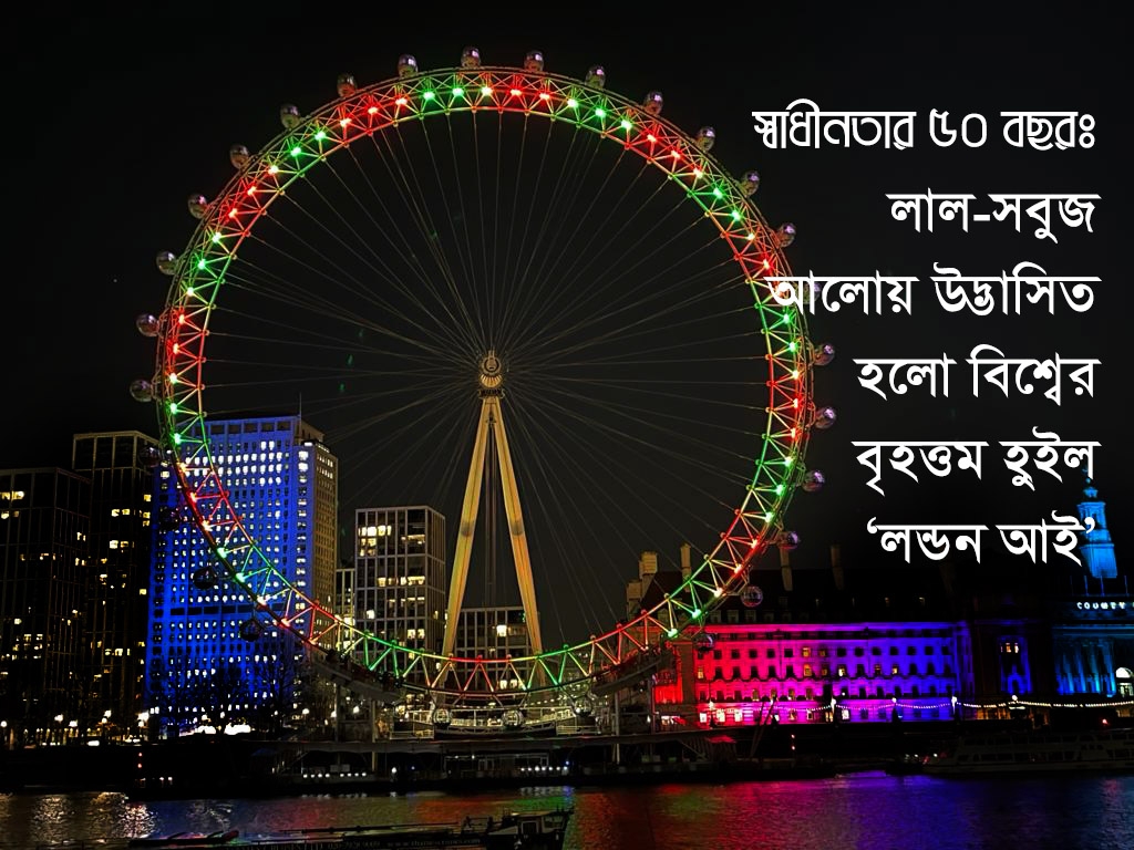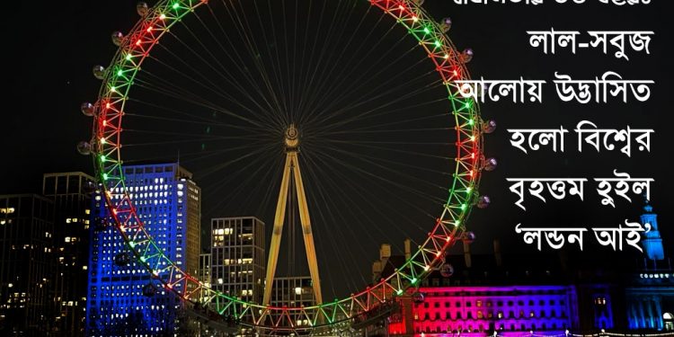 ২৬শে মার্চ বাংলাদেশের স্বাধীনতার ৫০ বছর পূর্তি উপলক্ষে শুক্রবার সন্ধ্যায় লন্ডনের আইকনিক স্থাপনা ‘লন্ডন আই’ লাল সবুজের রংয়ে আলোকিত হয়ে উঠে। ব্রিটিশ বাংলাদেশি পাওয়ার এ্যান্ড ইন্সপিরেশন (বিবিপিআই) ও লাষ্টমিনিট ডটকম লন্ডন আই পার্টনারশীপের ভিত্তিতে নেয়া হয় এই অনন্য উদ্যোগ। টেমস নদীর তীরে অবস্থিত এই স্থাপনা বিশ্বের সবচেয়ে বৃহত্তম একটি হুইল (চাকা) যার উপরে উঠলে ৪০ কিলোমিটার দুর পর্যন্ত পুরো লন্ডনের দৃশ্য দেখা যায়। এটি লন্ডনে পর্যটকদের অন্যতম দর্শনীয় স্থাপনা।